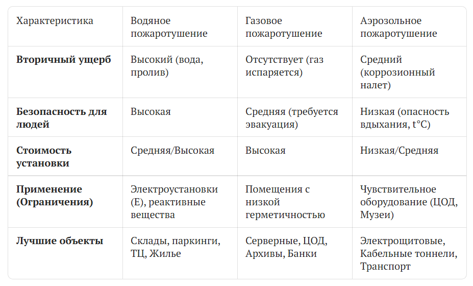 Выбор между водяным, газовым и аэрозольным пожаротушением должен основываться на приоритетах: защите жизни, сохранении имущества, стоимости владения и классе пожарной опасности.